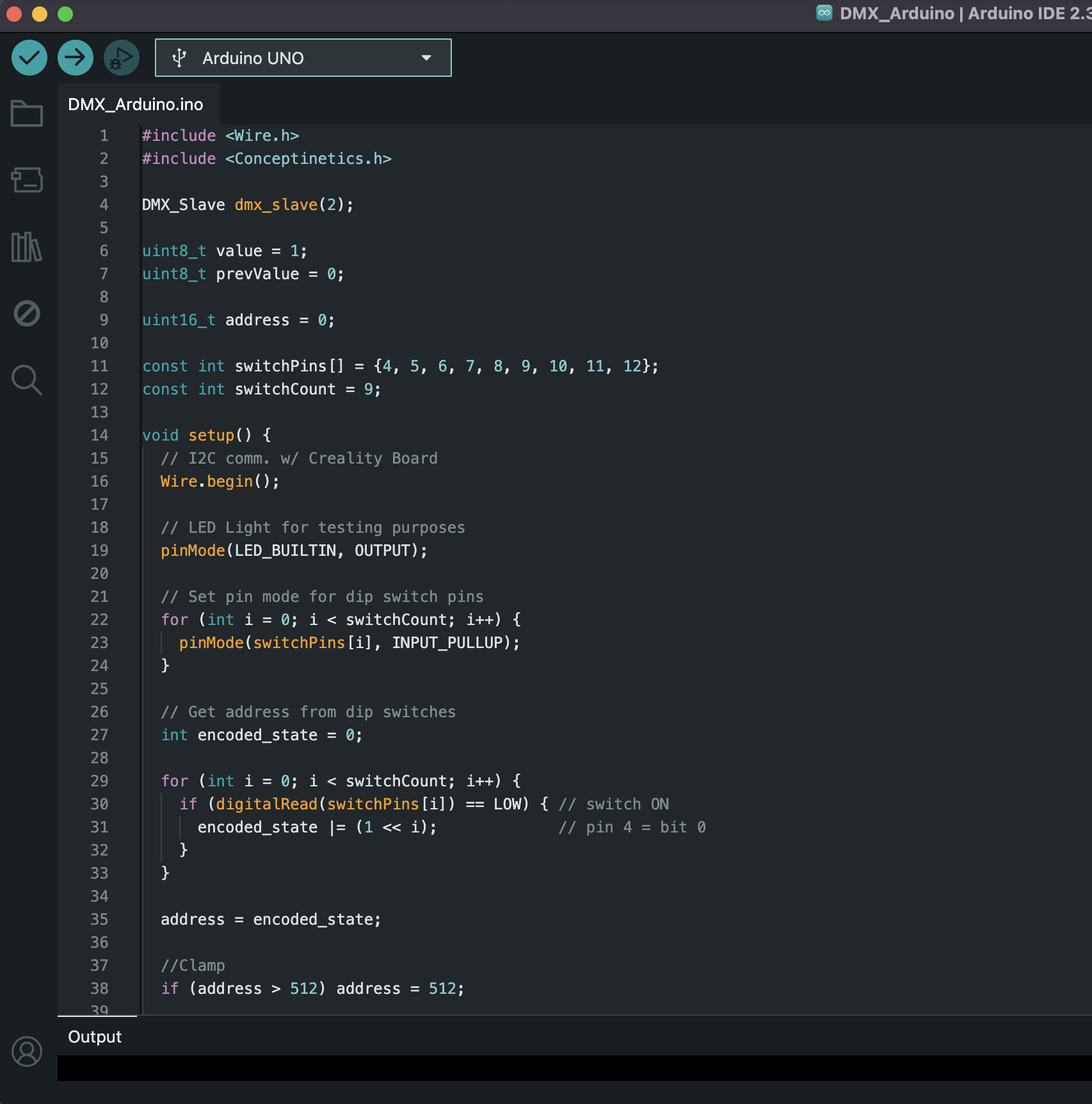 - Conceptinetics on the Arduino to receive DMX data